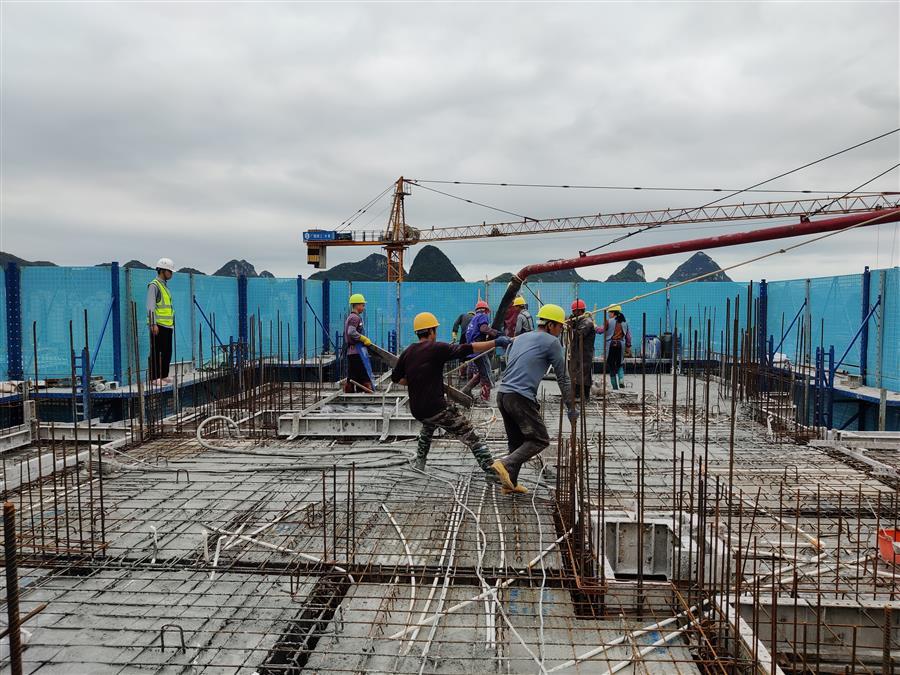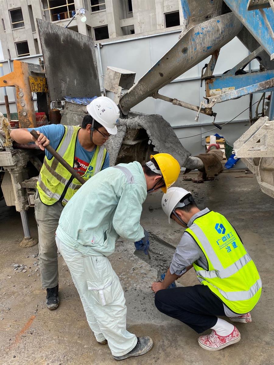 馬達聲、電鉆聲轟鳴,混凝土攪拌車、混凝土泵車、材料運輸板車、土方綠皮車來往穿梭,綁扎鋼筋、混凝土塌落度試驗、澆筑混凝土、升爬架前驗收等工作有條不紊進行,這是第四分公司融創(chuàng)江南林語項目的趕工現場。