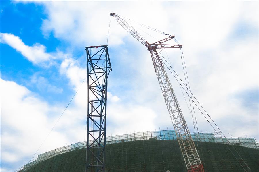 靖西市乒乓主題體育公園鋼結(jié)構(gòu)罩棚空間桁架采用三角桁架形式,桁架柱向外傾斜,與地面夾角呈65°,重量達25噸,桁架柱即徑向桁架為三角管桁架,整體結(jié)構(gòu)呈倒L形,根據(jù)其受力特點可分為懸挑式和前端支承式,懸挑式根部設(shè)置撐桿,撐桿連接在看臺勁性柱上。此次桁架吊裝難度大、技術(shù)要求高,項目部從構(gòu)件進場、精準定位、吊裝,每一道工序、每一個環(huán)節(jié)都實行全過程無縫隙標準化管理,全力確保安裝和細節(jié)符合技術(shù)要求。
