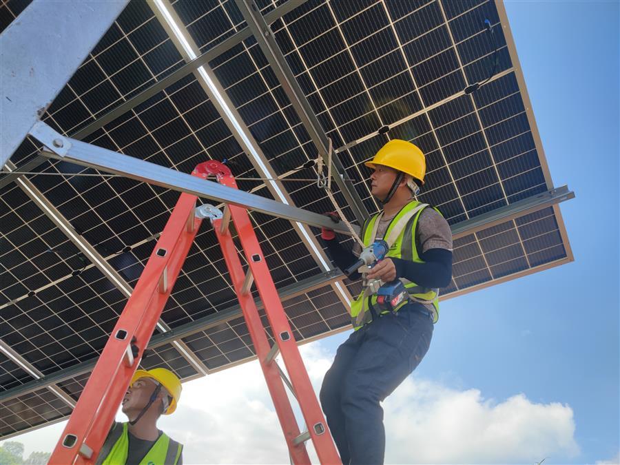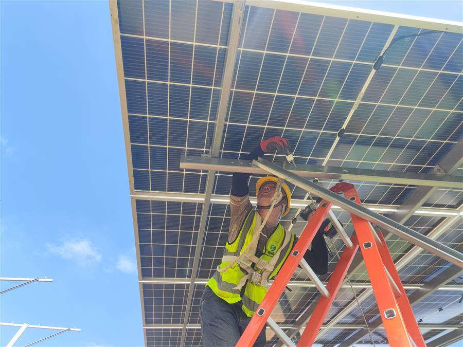 “我們戰(zhàn)高溫斗酷暑,搶工期、趕進(jìn)度,確保如期實(shí)現(xiàn)并網(wǎng)發(fā)電?!币苯ɑA(chǔ)分公司寧明縣寨安光伏項(xiàng)目建設(shè)工程項(xiàng)目負(fù)責(zé)人李世文說(shuō),施工現(xiàn)場(chǎng)在山坡上,遮陽(yáng)的地方少,光伏板和支架被太陽(yáng)炙烤得發(fā)燙,施工人員咬緊牙關(guān)克服困難,堅(jiān)守在工作一線。每天150余名施工人員輪流作業(yè),15臺(tái)機(jī)械設(shè)備晝夜運(yùn)轉(zhuǎn),1500多畝的項(xiàng)目現(xiàn)場(chǎng),一根根樁基豎起、一座座支架矗立,山坡上遍布光伏板。