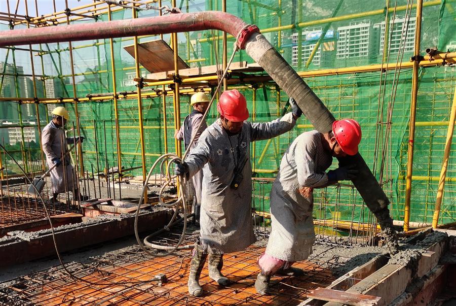 河池·澳門國際城四期工程位于河池市金城江區(qū)百旺路10號,總建筑面積13.76萬平方米,由5個單體建筑、地庫,以及配套設施工程等部分構成。目前,3個單體建筑均已施工至結構層8層梁板砼澆筑,項目累計完成總工程量的12.8%。