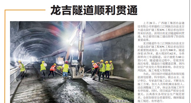 1月2日,《柳州日報》要聞版報道冶建公司桂海分公司承建的三江縣龍吉大道北段擴建工程,龍吉隧道順利貫通,項目建設(shè)取得階段性重要成果。