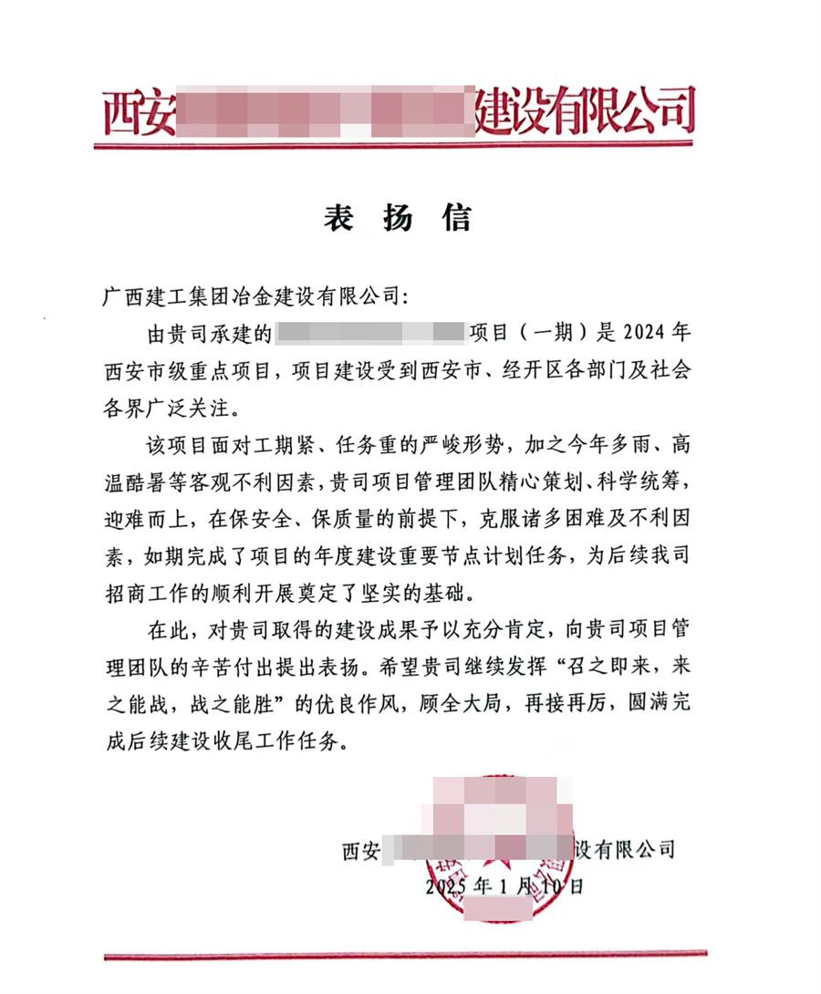 來信稱,冶建公司在項目施工時間緊、任務重的嚴峻形勢下,精心策劃、迎難而上,一手抓安全一手抓質量,克服諸多困難及不利因素,如期完成了項目的年度建設重要節(jié)點計劃任務,為后續(xù)招商工作的順利開展奠定了堅實的基礎。